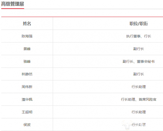 随着陈海强正式就任,直到今年4月,三名副行长分别为景峰、房产、